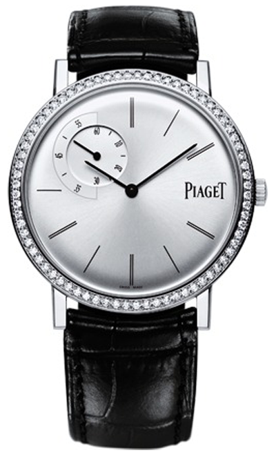 Đồng hồ Piaget Altiplano, 40 mm. Vỏ bằng vàng trắng 18K đính 72 viên kim cương cắt sáng chói (khoảng 1 ct). Mặt sau bằng kính sapphire. Chế tạo bộ máy cơ lên dây cót tay siêu mỏng Piaget 838P với giây nhỏ.