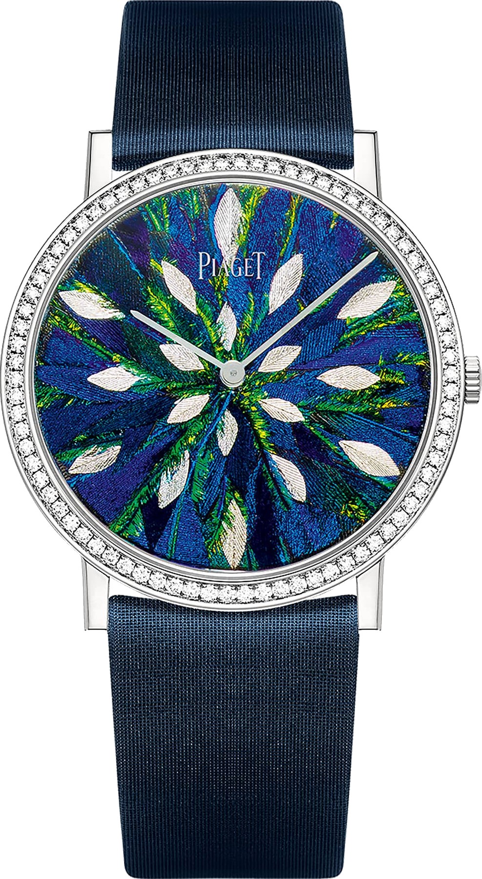 Đồng hồ siêu mỏng bằng vàng trắng và kim cương. Mặt số đính lông vũ. Dây đeo bằng da bê hiệu ứng satin màu xanh đậm. Là sự kết hợp giữa chuyên môn đa dạng của Piaget, chiếc đồng hồ nữ sang trọng này nâng cao biểu tượng chế tạo đồng hồ Altiplano bằng Tay nghề thủ công tinh xảo nhất. Một kiệt tác thực sự, mặt số được chế tác từ chất liệu lông vũ kết hợp lông công, lông vịt và lông gà trống được bao phủ một phần bằng lá bạc. Lấp lánh với 78 viên kim cương, vỏ bằng vàng trắng đường kính 38 mm có khả năng chịu nước ở mức 3 ATM và sở hữu bộ chuyển động Manufacturing Piaget, huyền thoại về độ mỏng: cỡ máy lên dây cót bằng tay siêu mỏng 430P, chỉ dày 2,1 mm. Một tác phẩm nghệ thuật thu nhỏ giới hạn ở 38 chiếc đồng hồ.