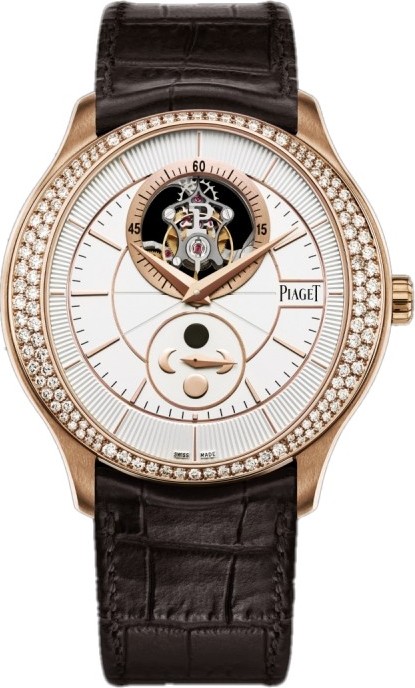 Đồng hồ Piaget Gouverneur, 43 mm. Vỏ bằng vàng hồng 18K đính 128 viên kim cương cắt sáng chói (khoảng 1,4 ct). Mặt số có họa tiết "sunburst" Guilloché với vạch chỉ giờ bằng vàng hồng 18K và chỉ báo tuần trăng. Mặt sau bằng sapphire nhỏ. Sản xuất bộ máy cơ lên dây cót tay pha mặt trăng tourbillon siêu mỏng của Piaget 642P. Phiên bản được đánh số.