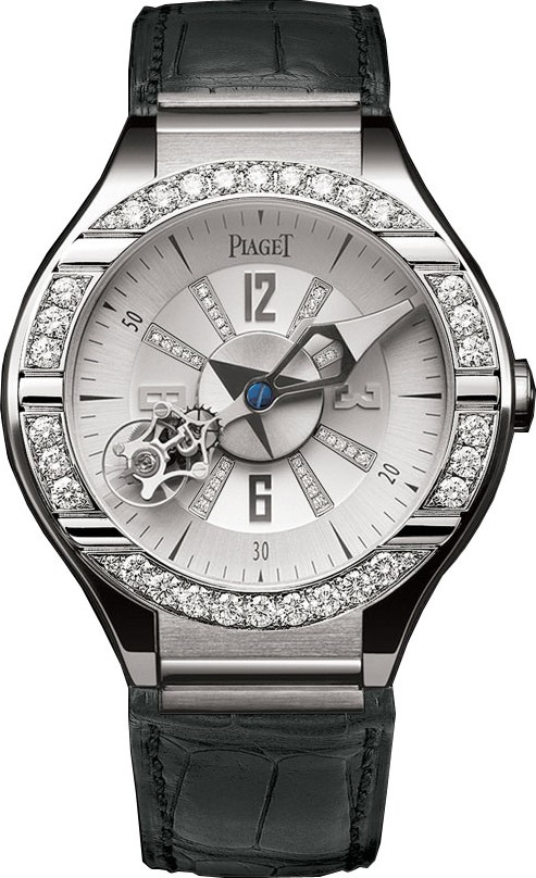 Đồng hồ tourbillon của Piaget Polo, 45 mm. Vỏ bằng vàng trắng 18K đính 34 viên kim cương cắt sáng chói (khoảng 2,3 ct). Mặt số và vạch chỉ giờ bằng vàng trắng 18K, nạm 40 viên kim cương cắt sáng chói (khoảng 0,1 ct). Sản xuất bộ chuyển động cơ học tourbillon relatif lên dây cót tay Piaget 608P. Phiên bản được đánh số.