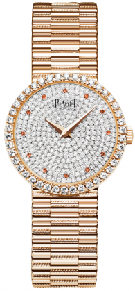 Đồng hồ truyền thống, 26 mm. Vỏ bằng vàng hồng 18K đính 42 viên kim cương cắt sáng chói (khoảng 0,6 ct). Bộ mặt số nạm 290 viên kim cương cắt sáng chói (khoảng 1 ct) với vạch chỉ giờ được nạm 12 viên ngọc hồng lựu màu nâu (khoảng 0,1 ct). Vòng tay vàng hồng 18K. Chế tạo bộ máy cơ siêu mỏng Piaget 430P lên dây bằng tay.