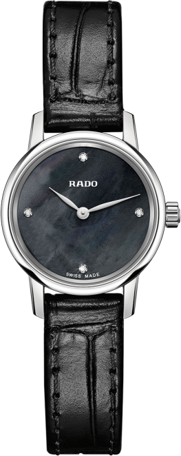 Rado Coupole Classic Mini chứng minh rằng việc giảm kích thước có thể đồng nghĩa với việc tăng kiểu dáng. Với mặt số xà cừ đen nạm kim cương, chiếc đồng hồ nhỏ nhắn này đang đưa nghệ thuật thể hiện sự nữ tính trở lại với đồng hồ bấm giờ. Dây đeo bằng da bê màu đen dập nổi cũng rất phù hợp để làm phụ kiện. Vỏ thép không gỉ với dây đeo bằng da màu đen. Vành thép không gỉ cố định. Mặt số xà cừ đen với kim chỉ màu bạc. Kim cương đánh dấu các vị trí 3, 6, 9 và 12 giờ. Kiểu mặt số: Analog. Bộ máy thạch anh Rado calibre 080. Mặt kính sapphire chống xước. Núm vặn dạng kéo/đẩy. Nắp lưng liền khối. Kiểu dáng vỏ tròn. Kích thước vỏ: 21 mm. Độ dày vỏ: 6,3 mm. Khả năng chống nước ở độ sâu 50 mét / 165 feet.