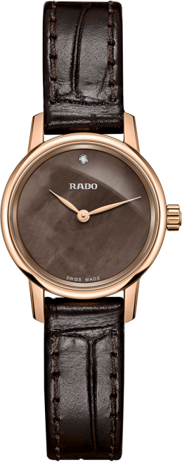 Những điều tốt đẹp đến trong những gói nhỏ, như đã được chứng minh bởi Rado Coupole Classic Mini. Với vỏ bằng thép không gỉ mạ PVD màu nâu hồng, dây đeo bằng da và mặt số xà cừ màu nâu, chiếc đồng hồ nhỏ nhắn này đang đưa nghệ thuật thể hiện sự nữ tính trở lại với đồng hồ bấm giờ. 1 viên kim cương đơn độc ở vị trí 12 giờ làm hoàn thiện chiếc đồng hồ tuyệt đẹp này. Vỏ thép không gỉ mạ PVD tông vàng hồng với dây đeo bằng da màu nâu. Vành thép không gỉ tông vàng cố định. Mặt số xà cừ nâu với kim đồng hồ tông vàng hồng. Kiểu mặt số: Analog. Bộ máy thạch anh Rado Calibre 080. Mặt kính sapphire chống trầy xước. Kiểu dáng vỏ tròn, kích thước vỏ: 21 mm, độ dày vỏ: 6,3 mm. Khả năng chống nước ở độ sâu 50 mét / 165 feet. Chức năng: giờ, phút.