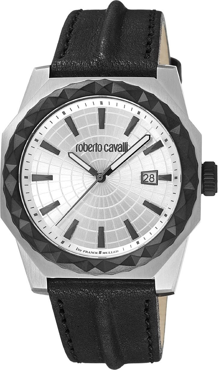 Đồng hồ Roberto Cavalli có vỏ bằng thép không gỉ 43mm, viền cố định, mặt số màu bạc và mặt kính sapphire.
