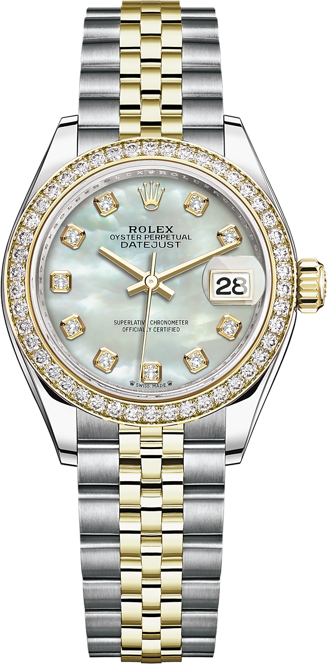 Sự phản chiếu ánh sáng trên các mặt vỏ và vấu làm nổi bật hình dáng thanh lịch của vỏ Oyster 28 mm, được trang bị đai kính nạm kim cương. Đồng hồ nữ cổ điển của Rolex, Lady-Datejust, thuộc dòng Datejust, mẫu đồng hồ biểu tượng đã trở thành biểu tượng cho phong cách và khả năng hiển thị giờ chính xác.