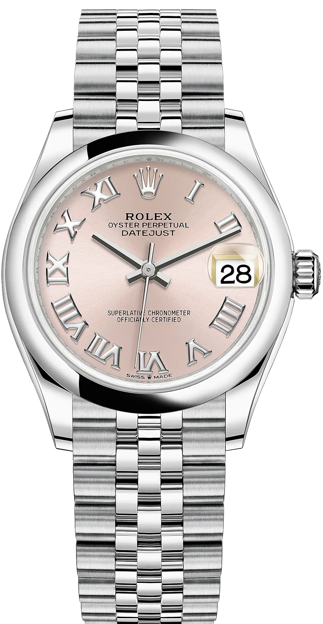 Đồng hồ Oyster Perpetual Datejust 31 bằng Oystersteel đi kèm mặt số màu hồng và dây đeo Jubilee.