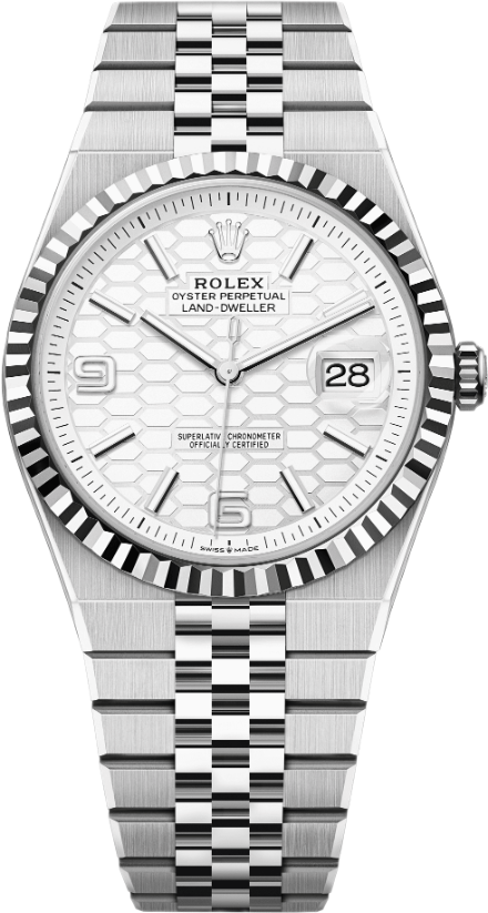 Land-Dweller 40 bằng thép Oystersteel và vàng trắng với mặt số màu trắng đậm, họa tiết tổ ong và dây đeo Flat Jubilee.