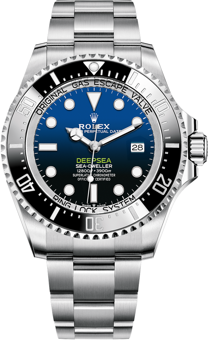 Nó có mặt số D-blue và vạch chỉ giờ phát quang lớn. Không thấm nước ở độ sâu 3.900 mét (12.800 feet) với vành bezel xoay một chiều trong 60 phút, Rolex Deepsea là một trong những chiếc đồng hồ dành cho thợ lặn siêu bền được Rolex thiết kế để khám phá biển sâu.