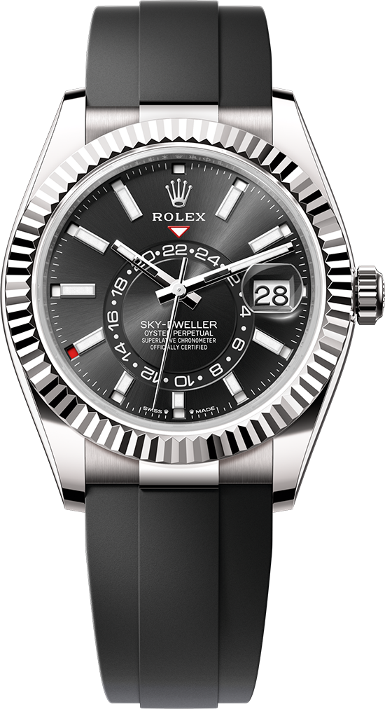 Đồng hồ Oyster Perpetual Sky-Dweller bằng vàng trắng 18 ct với mặt số màu đen sáng và dây đeo Oysterflex.