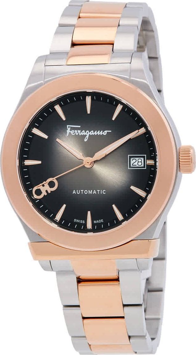 Đường kính vỏ 42 mm. Chất liệu vỏ Thép không gỉ. Hình dạng vỏ Tròn. Nắp lưng nguyên khối. Chất liệu dây đeo Thép không gỉ. Màu dây đeo Hai tông màu (Tông màu bạc và tông màu vàng hồng). Khóa Bướm. Màu mặt số Xám. Sapphire chống xước. Kim Đồng hồ tông màu vàng hồng Vạch chỉ giờ Giây. Biểu tượng Double-Gancio ở vị trí 8 giờ. Vành bezel Cố định Màu vành bezel. Tông màu vàng hồng. Chất liệu vành bezel Thép không gỉ. Núm vặn kéo/đẩy. Thương hiệu Ferragamo. Tên bộ sưu tập 1927. Giới tính Nam. Nhãn đồng hồ Sản xuất tại Thụy Sĩ Bộ máy Tự động. Các tính năng Lịch Hiển thị ngày ở vị trí 3 giờ. Chức năng Ngày, Giờ, Phút, Giây.