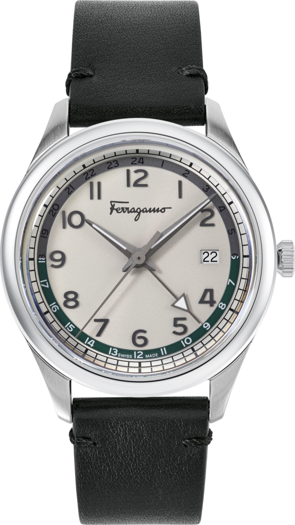 Ferragamo Timeless là chiếc đồng hồ có đường nét rõ ràng và sự chú ý đến từng chi tiết. Bắt đầu với mặt số sử dụng các chữ số Ả Rập, bộ chuyển động GMT và mặt kính Bombè đặc biệt tạo nên hình dáng rất tinh tế với ấn tượng mạnh mẽ.