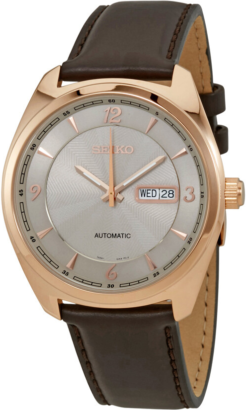 Vỏ thép không gỉ tông vàng hồng với dây đeo bằng da màu nâu. Vành bezel cố định tông vàng hồng. Mặt số màu xám với kim và vạch chỉ giờ tông vàng hồng. Chữ số Ả Rập đánh dấu các vị trí 3, 6, 9 và 12 giờ. Vạch chỉ phút xung quanh vành ngoài. Loại mặt số: Analog. Kim phát quang. Hiển thị thứ trong tuần và ngày ở vị trí 3 giờ. Bộ máy tự động Seiko calibre 7S26 với khả năng dự trữ năng lượng 40 giờ. Mặt kính khoáng chống trầy xước. Núm điều chỉnh kéo/đẩy. Nắp lưng trong suốt. Kích thước vỏ: 45 mm. Độ dày vỏ: 11,4 mm. Hình dạng vỏ tròn. Chiều rộng dây đeo: 20 mm. Khóa cài. Chống nước ở độ sâu 50 mét / 165 feet.