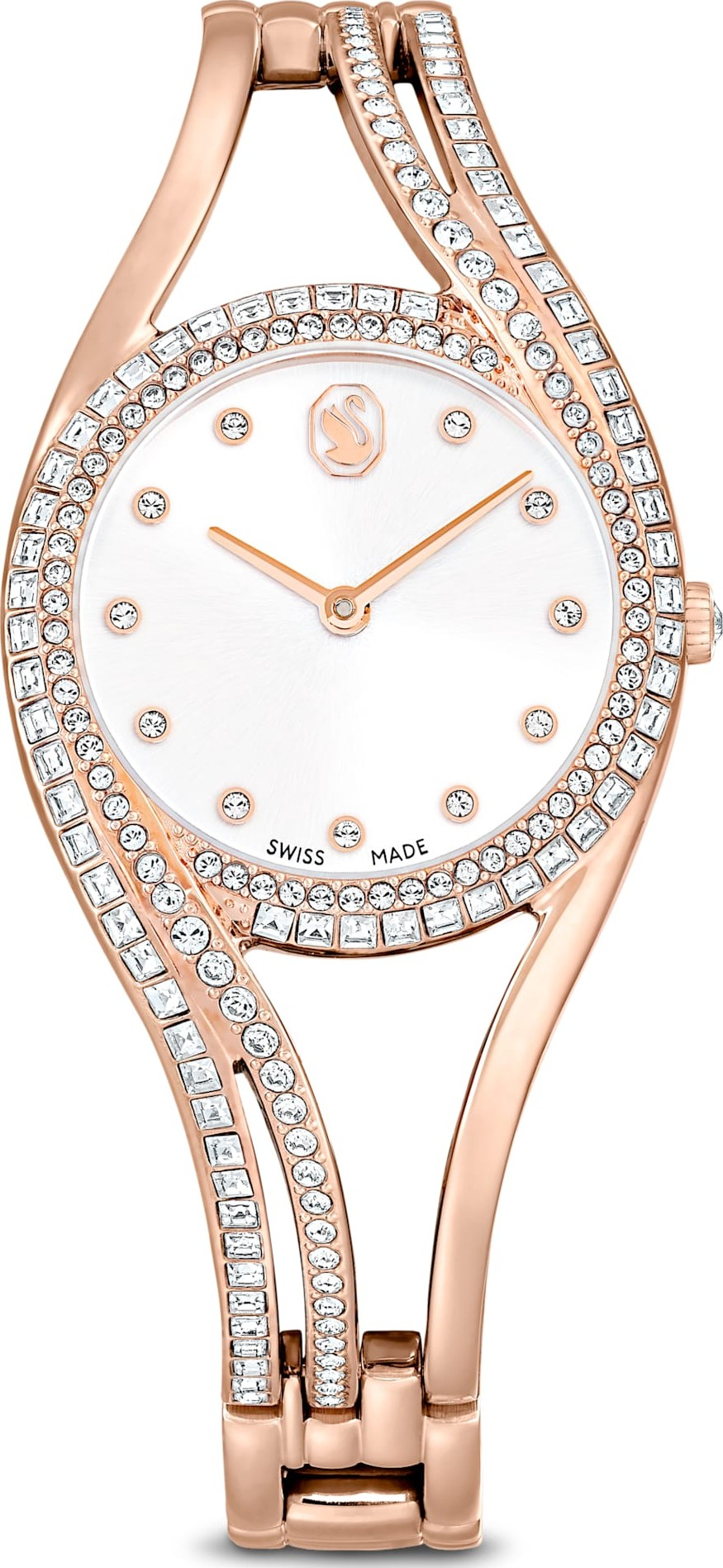 Nổi bật với những đường cong thanh lịch và vẻ tinh tế, chiếc đồng hồ đeo tay Hyperbola này xóa nhòa ranh giới giữa trang sức và đồng hồ. Vỏ thép không gỉ 28mm được hoàn thiện bằng lớp mạ vàng hồng và có phần viền và dây đeo kết hợp, được đính 176 viên pha lê trong suốt với các đường cắt hình vuông và hình tròn. Mặt số kiểu tia nắng cũng hiển thị 11 vạch chỉ giờ được làm bằng pha lê, cùng với logo Thiên Nga ở vị trí 12 giờ. Để hoàn thiện vẻ đẹp, chiếc đồng hồ sản xuất tại Thụy Sĩ này còn có một viên pha lê được đính trên núm vặn, đồng thời có khả năng chống nước ở độ sâu 50m. Đây là một lựa chọn đồng hồ hiện đại kết hợp giữa tính nghệ thuật và sự tinh xảo hoàn hảo. Bộ sưu tập: Hyperbola. Kích thước vỏ: 1 1/8 x 1 1/8 inch. Độ dày vỏ: 1/4 inch. Chiều dài dây đeo có thể đeo (tối thiểu - tối đa): 5 1/4 - 7 3/8 inch. Chiều rộng dây đeo: 3/8 inch. Chất liệu: Pha lê, mạ PVD vàng hồng. Màu sắc: Trắng. Loại khóa: Khóa gập. Chất liệu dây đeo: Kim loại. Sản xuất tại: Thụy Sĩ. Cơ chế: Thạch anh.