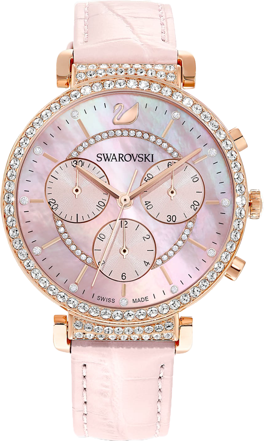Là sự pha trộn hoàn hảo giữa hiện đại và truyền thống, chiếc đồng hồ bấm giờ sang trọng này của Swarovski sẽ nâng tầm mọi trang phục. Nổi bật với vỏ thép không gỉ phủ PVD tông màu vàng hồng hiện đại và mặt số xà cừ màu hồng, thiết kế sang trọng và lãng mạn lấp lánh với 100 viên pha lê trong suốt, được đặt trong pavé phong phú. Bộ chuyển động bấm giờ được tích hợp tinh tế, bộ ba mặt số và dây đeo bằng da thật màu hồng, với họa tiết cá sấu và cơ chế tháo nhanh, góp phần tăng thêm sự tinh tế. Một kiểu dáng cổ điển vượt thời gian để mặc ở bất cứ đâu, nó phù hợp với mọi thứ, từ quần jean, áo phông cho đến váy dạ hội. Được sản xuất tại Thụy Sĩ, nó có khả năng chống nước ở độ sâu 50m.