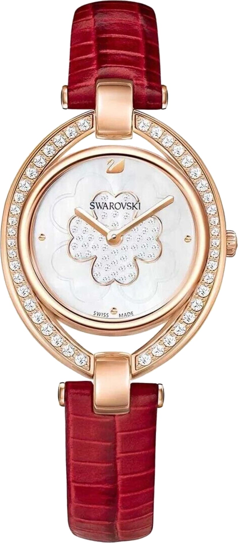 Thương hiệu Swarovski. Bộ sưu tập Stella. Màu dây đeo: Đỏ. Chất liệu dây đeo: Da. Mặt kính Sapphire Chống trầy xước. Chất liệu vỏ: Thép không gỉ. Chiều rộng vỏ: 37.0 mm. Khả năng chống nước: 30 m (100 feet). Màu mặt số: Xà cừ. Loại máy: Quartz. Màu mặt số: Vàng hồng. Màu vỏ: Vàng hồng.