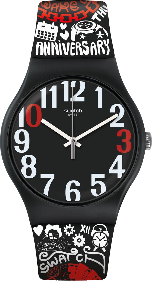 Năm nay, chúng tôi kỷ niệm sinh nhật lần thứ 30 của câu lạc bộ swatch! Chúng tôi đang tiến bước lớn và táo bạo với mẫu dành cho quý ông mới màu đỏ, đen và trắng có tên là 30 và tích tắc (suoz322). Số 3 và 0 trên mặt số có màu đỏ và họa tiết vẽ nguệch ngoạc trên dây đeo màu đen cũng có số 3 và 0 màu đỏ. Chiếc đồng hồ này được đóng gói trong bao bì đặc biệt và phần khảm liệt kê tên của tất cả các đồng hồ của câu lạc bộ trong hơn ba thập kỷ qua.