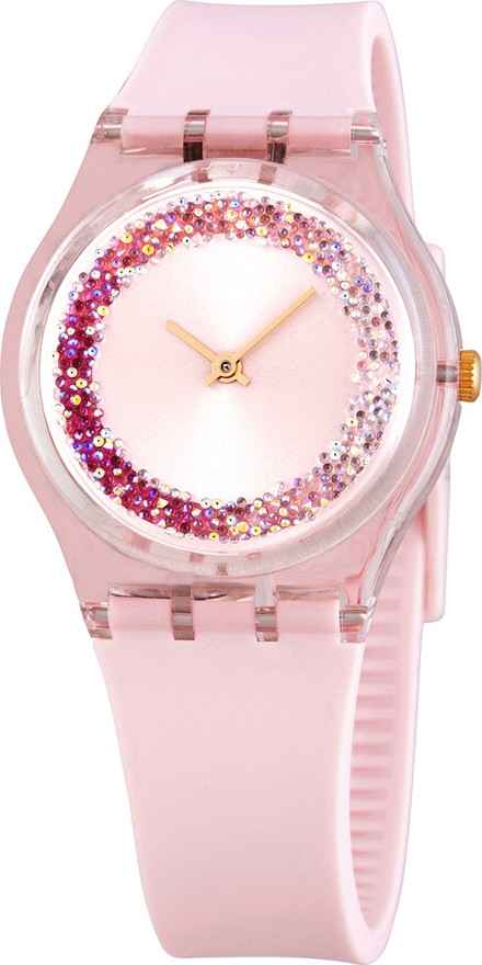 Kwartzy màu hồng (gp164) trông thật hoàn hảo dưới ánh nắng mặt trời với một chiếc nhẫn pha lê có đủ sắc hồng trên mặt số được đánh bóng bằng tia nắng rực rỡ. Dây đeo trong suốt có tông màu hồng.