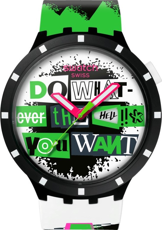 Chiếc đồng hồ ngoại cỡ này nổi bật với mặt số màu trắng in nhiều màu sắc với dòng chữ "Do whatever the … you want" (Làm bất cứ điều gì bạn muốn), trong khi cửa sổ ngày-thứ đặc biệt lấp đầy khoảng trống bằng một từ mới trong 14 ngày. Kim giờ và kim phút màu hồng cùng kim giây màu xanh lá cây, tất cả đều có hiệu ứng phát sáng trong bóng tối, hiển thị thời gian dưới lớp kính sinh học. Vỏ gốm sinh học màu đen mờ kết hợp với vành bezel đồng bộ in màu trắng. Dây đeo màu trắng mờ in nhiều màu, vòng lặp màu trắng mờ in màu đen, vòng lặp màu đen mờ và khóa nửa màu đen mờ hoàn thiện chiếc đồng hồ. Bộ máy: Thạch anh. Chống nước: 3 Bar. Đường kính: 47,00 mm. Độ dày: 11,75 mm. Khoảng cách giữa các vấu: 44,80 mm. Chất liệu dây đeo: Silicone. Chất liệu khóa: Nhôm. Khóa dây đeo: Khóa nửa. Chất liệu vỏ: Gốm sinh học. Màu sắc: Đen. Màu dây đeo: Đen. Màu mặt số: Trắng. Màu vỏ: Đen. Dòng sản phẩm: BIG BOLD