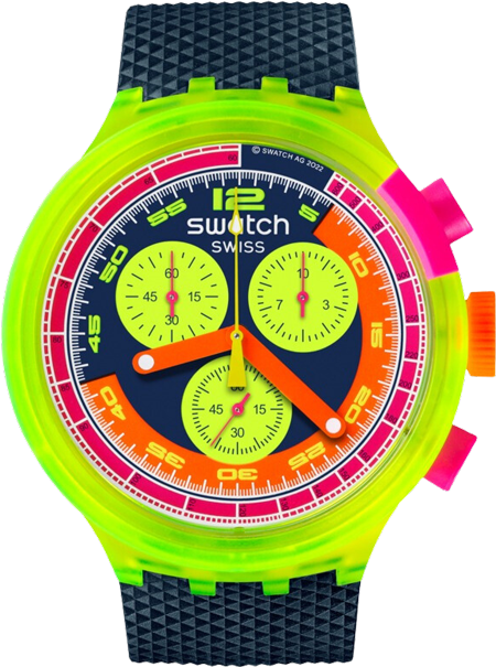 Chiếc đồng hồ cổ điển có màu sắc rực rỡ này được lấy cảm hứng từ chiếc đồng hồ Swatch của thập niên 90: SKYCHART GN705. Mặt số neon nhiều màu của nó được đặt trong một chiếc vỏ có nguồn gốc sinh học màu vàng trong suốt. Dây đeo màu hồng đậm và khóa màu vàng trong suốt hoàn thiện vẻ ngoài neon của chiếc Swatch cổ điển này.