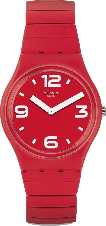 Vỏ nhựa màu đỏ với vòng đeo tay mở rộng bằng thép không gỉ bọc nhựa màu đỏ. Cố định viền nhựa màu đỏ. Mặt số màu đỏ với kim màu bạc và vạch chỉ giờ. Chữ số Ả Rập xuất hiện ở các vị trí 3, 6, 9 và 12 giờ. Loại quay số: Analog. Chuyển động thạch anh. Tinh thể khoáng chống trầy xước. Kéo/đẩy vương miện. Vỏ sau chắc chắn. Hình dạng vỏ tròn. Kích thước vỏ: 34 mm. Độ dày vỏ: 9 mm. Chiều rộng dải: 18 mm. Chống nước ở độ sâu 30 mét / 100 feet.