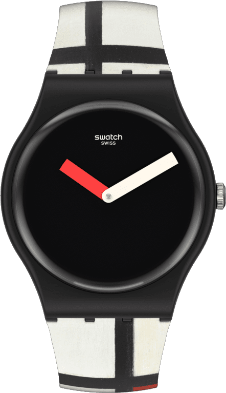 Chiếc đồng hồ dành cho quý ông mới hợp tác với nghệ thuật swatch này nhằm tôn vinh bức tranh nổi tiếng nhất của Piet Mondrian – 'thành phần có màu đỏ, xanh và trắng ii' – với dây đeo silicon màu đen mờ chắc chắn có in hình toàn thân nhiều màu theo phong cách đặc trưng của ông. Mặt số màu đen với chữ in màu trắng làm nền cho các kim màu trắng và đỏ giúp hoàn thiện vẻ ngoài của chiếc đồng hồ hợp tác bảo tàng bộ sưu tập swatch x center pompidou này.