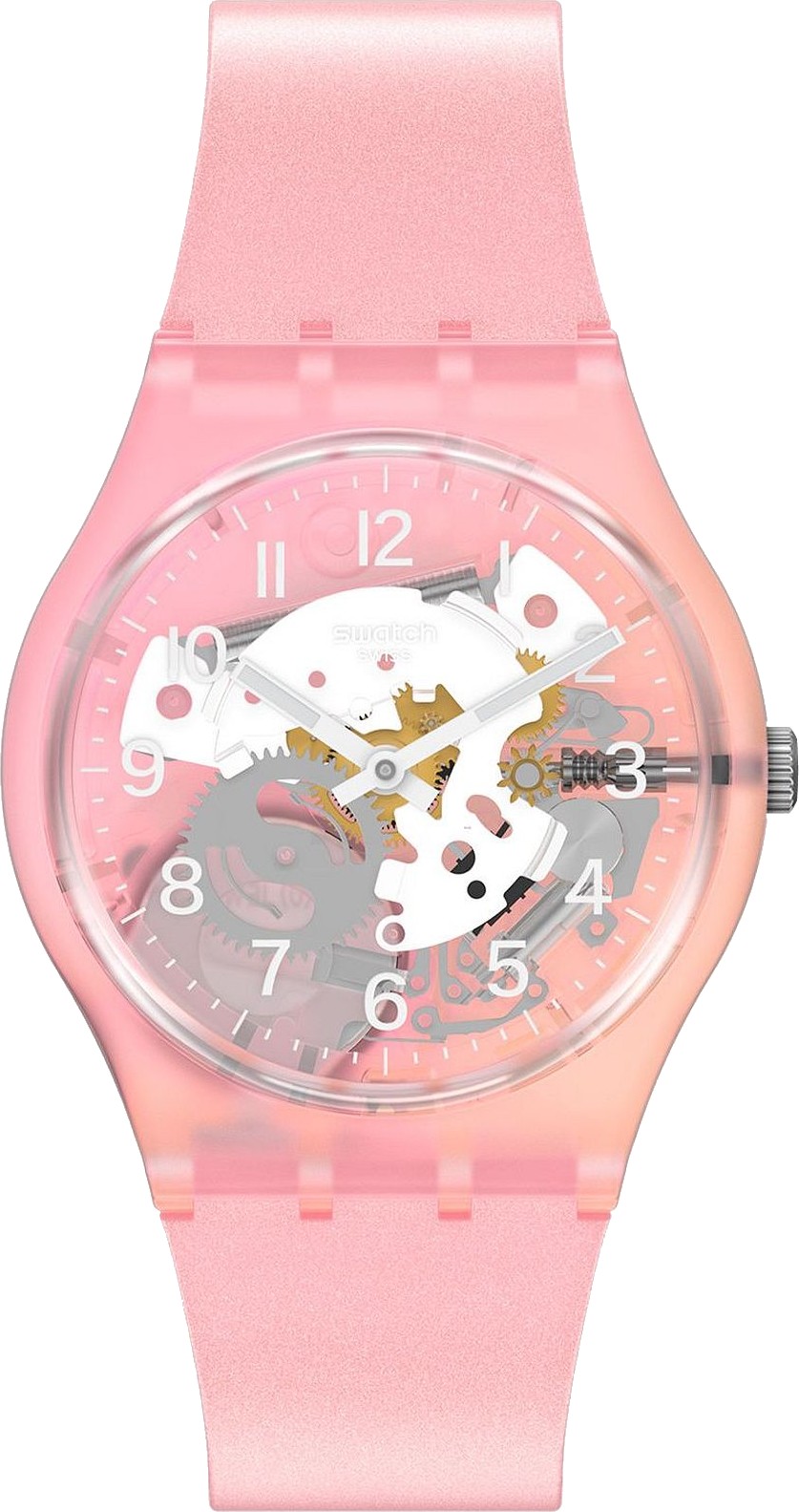 Nổi bật với dây đeo silicon màu hồng mờ trong suốt với hiệu ứng anodizing, vỏ có in chuyển màu nhiều màu và các bộ phận chuyển động màu trắng.