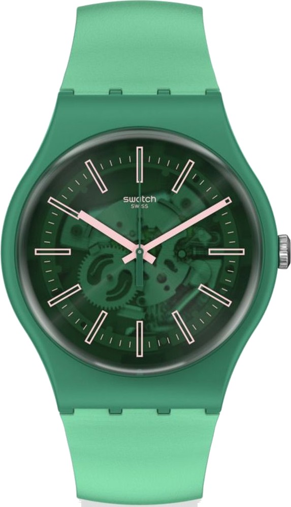 Điểm nổi bật của chiếc đồng hồ có nguồn gốc sinh học dành cho quý ông mới này là mặt số trong suốt được đánh bóng bằng tia nắng với các họa tiết màu xanh lá cây và hồng và kính có nguồn gốc sinh học. Màu xanh mờ đặc của vỏ, dây đeo, vòng và khóa bằng nhựa có nguồn gốc sinh học mang lại phông nền lý tưởng cho món đồ trung tâm tinh xảo này.