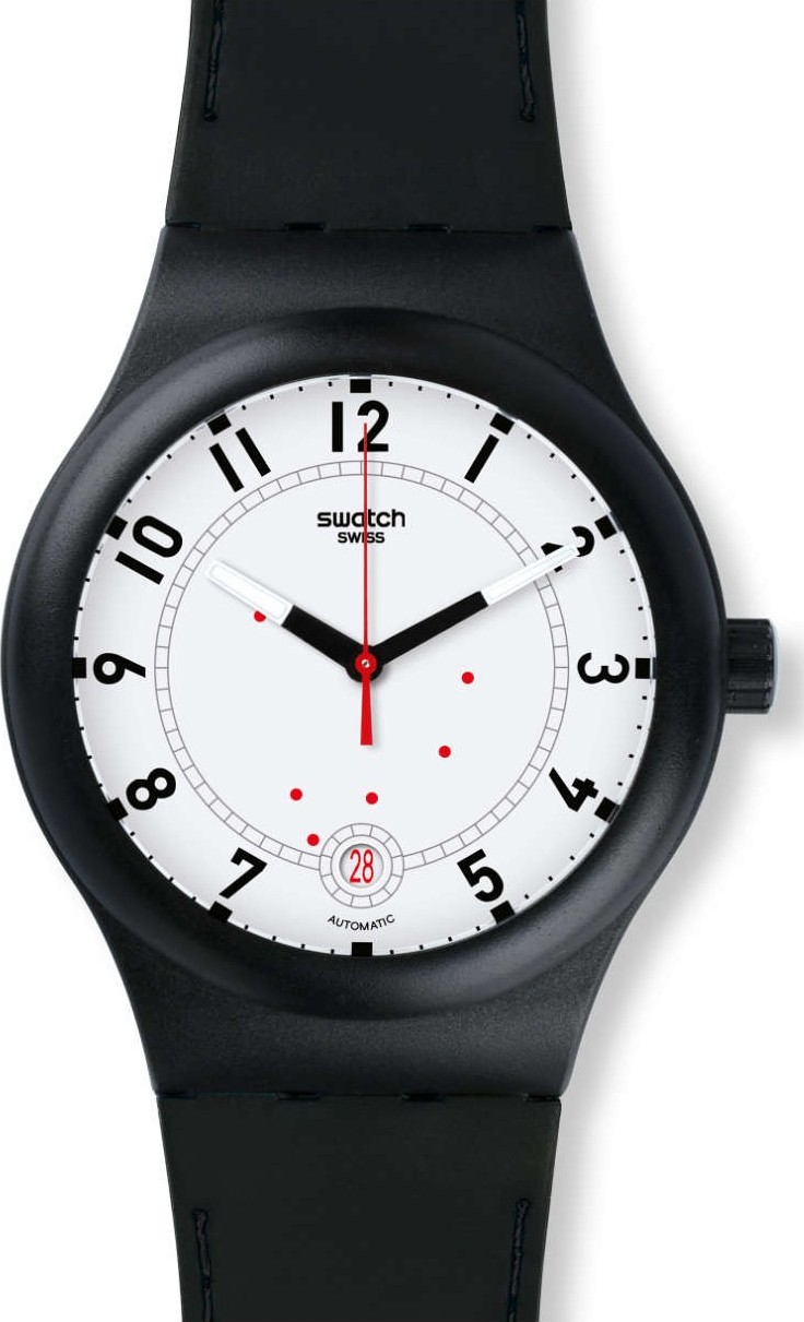 - Đồng hồ tự động Thụy Sĩ với dây đeo silicon màu đen và vỏ nhựa với mặt số màu trắng cố định với màn hình hiển thị ngày và vạch chỉ giờ Ả Rập màu đen