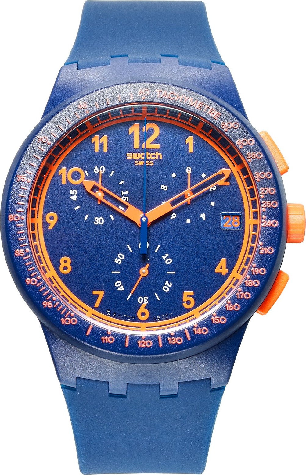 - Mặt đồng hồ bấm giờ màu xanh lam với các chữ số màu cam, hai kim, kim giây màu xanh lam, cửa sổ ngày, ba mặt số phụ và logo