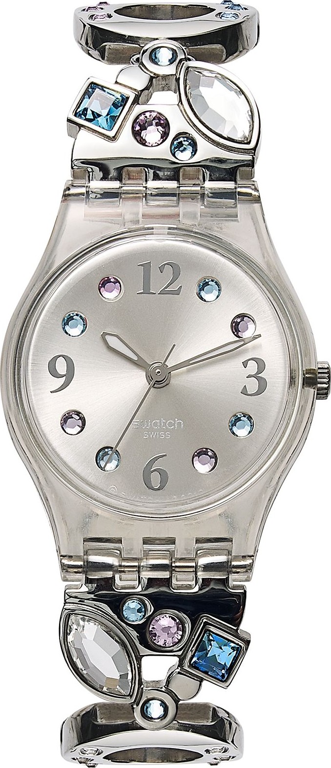 - Mặt đồng hồ màu bạc với các vạch pha lê màu hồng, trong và xanh, cọc số tông màu bạc và kim dạ quang