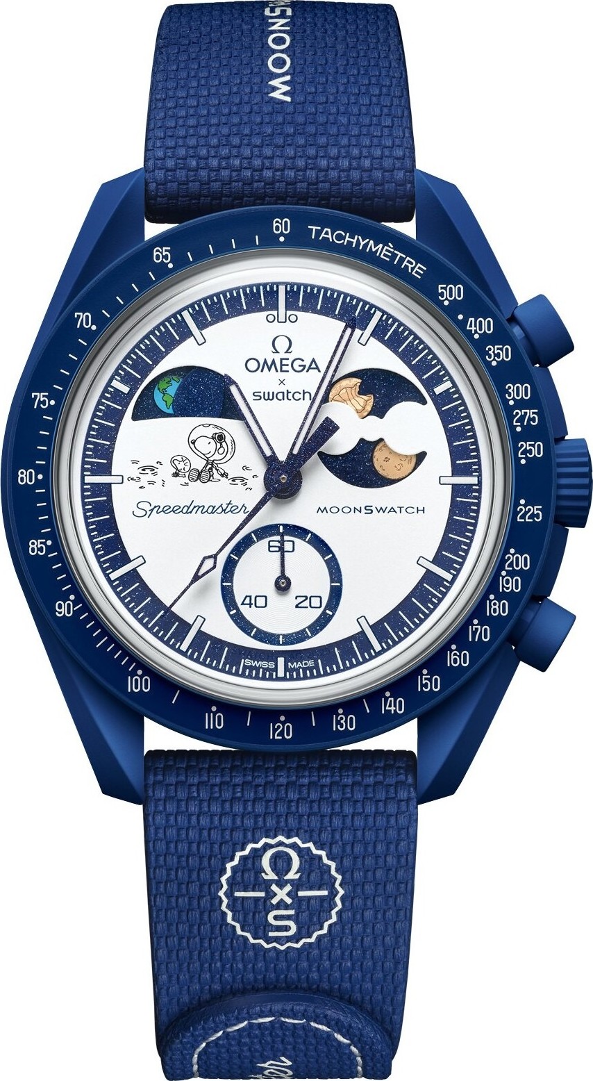 Chiếc đồng hồ bấm giờ này có vỏ, núm điều chỉnh và nút bấm Bioceramic màu xanh nước biển, kết hợp với dây đeo cao su xanh nước biển đồng bộ và vòng lặp Bioceramic. Đồng hồ có mặt số opaline màu trắng với các vạch chỉ giờ được phủ Super-LumiNova® hạng A (phát quang màu xanh lá cây). Ở vị trí 10 giờ, chỉ báo pha trái đất hiển thị Trái đất với đại dương phát sáng màu xanh dưới tia UV. Bên dưới chỉ báo pha trái đất là hình minh họa Snoopy và Woodstock trên Mặt trăng, đang kinh ngạc trước cảnh tượng mê hoặc của Trái đất. Hình minh họa thể hiện một cụm từ chỉ xuất hiện dưới tia UV. Ở mặt số phụ 2 giờ là chỉ báo pha mặt trăng với hai mặt trăng tròn rạng rỡ, cả hai đều được phủ Moonshine™ Gold của OMEGA. Một trong hai mặt trăng được thiết kế theo phong cách đặc trưng của thế giới Snoopy, trong khi mặt trăng còn lại được tái hiện thành mặt trăng bị hải ly cắn. Nắp pin được trang trí bằng thiết kế lấy cảm hứng từ Trái đất, trong khi dây đeo cao su xanh nước biển có khóa VELCRO® thêm một chút phong cách phi hành gia. Mặt số của mỗi chiếc đồng hồ trong bộ sưu tập này đều mang thương hiệu OMEGA X Swatch, logo Speedmaster biểu tượng và logo MoonSwatch. Điểm chung của tất cả các mẫu đồng hồ là cấu trúc kính sinh học hình hộp, chữ "S" khắc ở giữa mặt kính tượng trưng cho logo Swatch, họa tiết tròn tinh xảo trên vành ngoài mặt số và các mặt số phụ lõm, cấu trúc vấu sắc nét và mượt mà, và tất nhiên là cảm giác gốm sinh học độc đáo. Các vạch chỉ giờ, kim giờ, kim phút và đầu kim giây chronograph đều được phủ lớp Super-LumiNova® hạng A, cho khả năng phát sáng hoàn hảo trong bóng tối (phát quang xanh lục). Chất liệu vỏ: vỏ gốm sinh học xanh navy, núm vặn và nút bấm. Đường kính vỏ: 42,00 mm. Độ dày vỏ: 13,75 mm. Khoảng cách giữa vấu và vấu: 47,30 mm. Bộ máy thạch anh: chronograph (chỉ giây) với chỉ báo pha mặt trăng và pha trái đất. Khả năng chống nước: 3 bar. Dây đeo: dây cao su xanh navy với khóa VELCRO®, vòng lặp gốm sinh học xanh navy