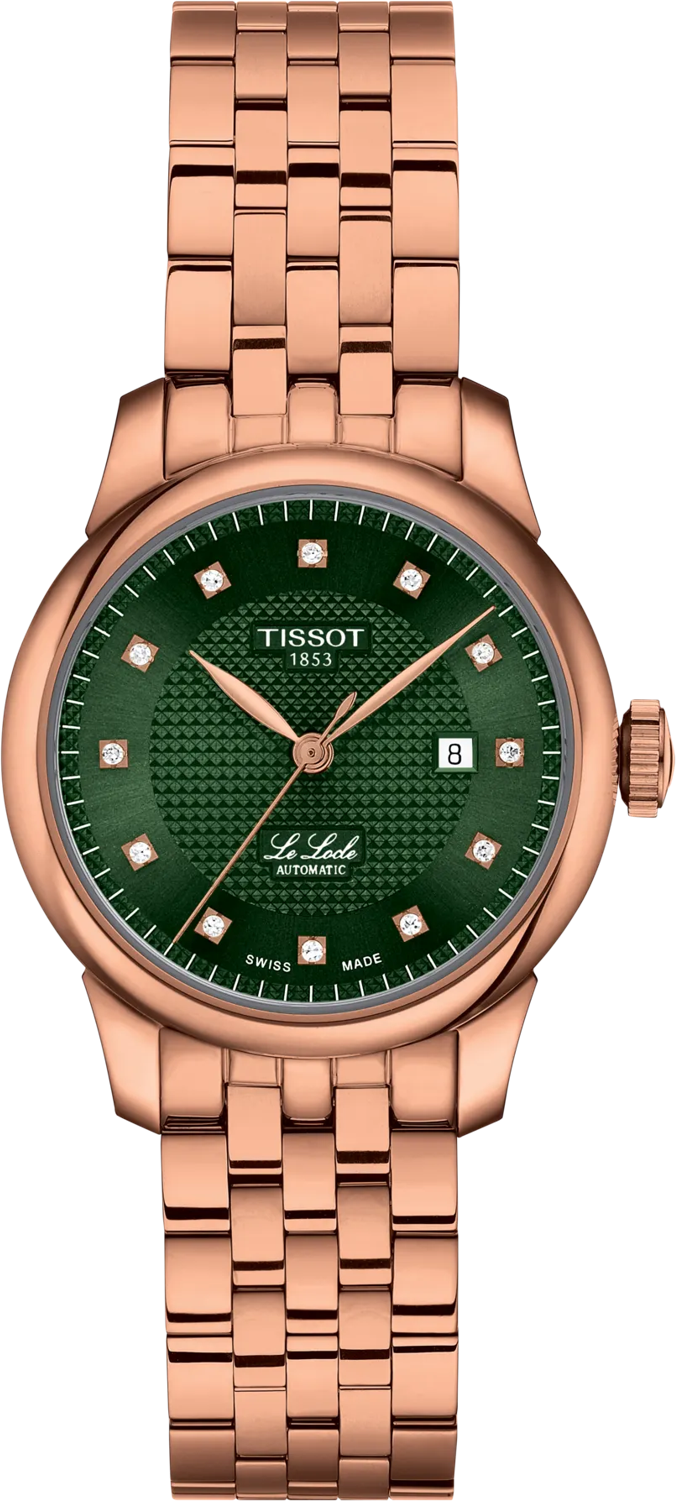 Bộ sưu tập Le Locle được giới thiệu lần đầu vào năm 2003 để kỷ niệm 150 năm thành lập Tissot. Chiếc đồng hồ này là một phần lịch sử, thể hiện tinh thần đổi mới đã định hình thương hiệu của chúng tôi trong hơn một thế kỷ qua. Mẫu đồng hồ này có mặt số màu xanh lá cây, thay thế các chỉ số La Mã bằng mười hai viên kim cương lấp lánh, và được trang bị dây đeo có thể thay thế nhanh chóng. Tất cả các đồng hồ Le Locle đều có mặt số họa tiết clous de Paris “guilloche” tuyệt đẹp dưới dạng các kim tự tháp nhỏ: một chi tiết thực sự tạo nên sự khác biệt. Sự kết hợp giữa các bề mặt được đánh bóng và chải xước trên các mắt xích tạo nên một nhịp điệu thị giác quyến rũ, bắt sáng với mỗi chuyển động. Chiếc đồng hồ này thể hiện sự quyến rũ của di sản Thụy Sĩ, với tên "Le Locle" được khắc nghiêng trên mặt số, tạo thêm nét tinh tế cho thiết kế. Mẫu mới nhất được trang bị công nghệ Nivachron Spring Balance tiên tiến, giúp giảm thiểu đáng kể ảnh hưởng của từ trường đồng thời có khả năng chống sốc, lão hóa và thay đổi nhiệt độ. Mẫu đồng hồ này có chức năng hiển thị ngày và mặt sau trong suốt để lộ bộ máy hoạt động đầy mê hoặc. Bộ sưu tập: Cổ điển Truyền thống. Trọng lượng (g): 77.00. Chiều dài: 29.00. Chiều rộng: 29.00. Độ dày: 8.95. Khoảng cách giữa các càng: 14.00. Chống nước ở áp suất lên đến 3 bar (30 m / 100 ft). Hình dạng vỏ: Tròn. Chất liệu vỏ: Thép không gỉ 316L mạ PVD vàng hồng. Tùy chọn vỏ: Mặt sau trong suốt. Mặt kính: Kính sapphire chống trầy xước. Năng lượng: Tự động. Bộ máy: Tự động Thụy Sĩ. Dự trữ năng lượng lên đến 48 giờ. Lò xo cân bằng Nivachron được cấp bằng sáng chế. Mặt số: HMSD (Giờ, Phút, Giây, Ngày). Cỡ máy: 7 3/4'''. Đường kính (mm): 17.2. Màu mặt số: Xanh lá cây. Kim cương: 12.00 Carat 0.05. Độ tinh khiết: vs-si. Màu sắc: Top Wesselton. Kiểu cắt: Cắt đơn 8/8. Mã số dây đeo/dây chuyền T605051513. Lớp phủ vòng đeo tay PVD. Màu dây đeo: Vàng hồng 5N. Khóa: Khóa bướm có nút bấm, vòng đeo tay tháo lắp nhanh có thể thay thế. Tùy chọn khóa: Vòng đeo tay tháo lắp nhanh có thể thay thế. Mã số mắt xích: T613051514.
