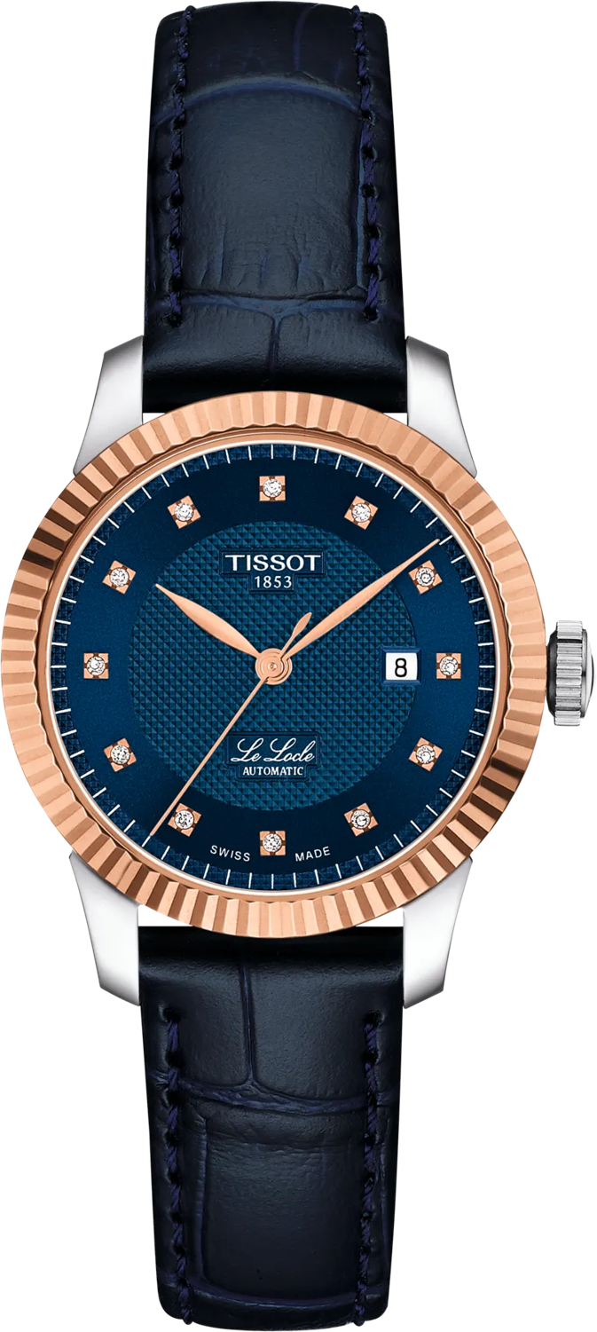 Được đặt tên theo quê hương của Tissot, mẫu Tissot Le Locle thể hiện trọn vẹn DNA thương hiệu cùng những giá trị chế tác tinh xảo. Le Locle Automatic Lady, vận hành bằng bộ máy automatic Thụy Sĩ, toát lên vẻ thanh lịch và tinh tế. Hãy khám phá mẫu đồng hồ này với cọc số kim cương cùng vành bezel khía bằng vàng hồng 18K, mang đến phong cách sang trọng và đầy cuốn hút. Dây da được phối màu hài hòa với mặt số, trang bị khóa bướm có nút bấm, dễ dàng tháo lắp và thay thế. Chiếc đồng hồ này sẽ là điểm nhấn hoàn hảo cho cả trang phục ban ngày lẫn buổi tối. Bộ sưu tập: Classic Traditional. Trọng lượng: 42 g. Kích thước vỏ: 29 × 29 mm. Độ dày: 8,95 mm. Khoảng cách càng: 14 mm. Khả năng chống nước: 3 bar (30 m / 100 ft). Hình dáng vỏ: Tròn. Chất liệu vỏ: Thép không gỉ 316L với vành bezel vàng hồng 18K. Tùy chọn vỏ: Mặt lưng trong suốt. Mặt kính: Sapphire chống trầy xước, phủ chống phản chiếu. Năng lượng: Tự động. Bộ máy: Automatic Thụy Sĩ. Thời gian trữ cót: Lên đến 48 giờ. Chức năng: Lò xo cân bằng Nivachron được cấp bằng sáng chế. Hiển thị: Giờ, phút, giây, ngày (HMSD). Caliber: 7 3/4'''. Đường kính máy: 17,2 mm. Màu mặt số: Xanh dương. Cọc số: Kim cương. Số lượng kim cương: 12 viên. Tổng trọng lượng: 0,05 carat. Độ tinh khiết: VS–SI. Màu sắc: Top Wesselton. Kiểu cắt: Single cut 8/8. Mã dây: T600049328. Chiều dài dây (6h): 105 mm. Chiều dài dây (12h): 70 mm. Mặt ngoài dây: Da bò vân kiểu da cá sấu. Mặt trong dây: Vật liệu tổng hợp. Màu dây: Xanh dương. Khóa: Khóa bướm có nút bấm, dây tháo lắp nhanh. Tùy chọn khóa: Dây tháo lắp nhanh.