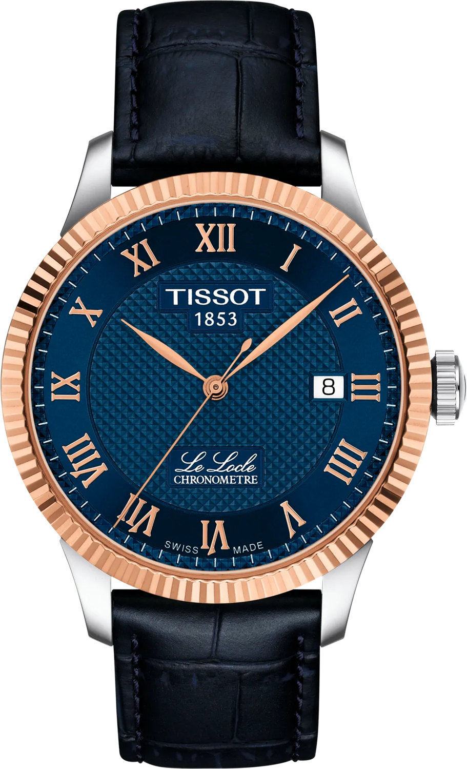 Được đặt tên theo quê hương của Tissot và được tạo ra để kỷ niệm 150 năm thành lập, dòng Le Locle thể hiện hoàn hảo DNA và các giá trị thủ công của thương hiệu. Được trang bị bộ máy Powermatic 80 với khả năng dự trữ năng lượng 80 giờ, Le Locle Powermatic 80 sở hữu các chữ số La Mã tuyệt đẹp và chữ ký Le Locle truyền thống. Bộ sưu tập Cổ điển Truyền thống. Trọng lượng (g) 72.00. Khám phá mẫu đồng hồ này với mặt số màu xanh lam và dây đeo da cùng màu, với vành bezel khía rãnh tuyệt đẹp bằng vàng hồng 18 carat mang đến vẻ ngoài sang trọng và thanh lịch. Chiều dài 39.30. Chiều rộng 39.30. Độ dày 10.45. Khoảng cách giữa các càng 19.00. Chống nước ở áp suất lên đến 3 bar (30 m / 100 ft). Hình dạng vỏ Tròn. Chất liệu vỏ Thép không gỉ 316L với vành bezel vàng hồng 18K. Tùy chọn vỏ Mặt sau trong suốt. Mặt kính Kính sapphire chống trầy xước với lớp phủ chống phản chiếu. Năng lượng Tự động. Bộ máy Tự động Thụy Sĩ. Thời gian dự trữ năng lượng lên đến 80 giờ. Mặt số HMSD (Giờ, Phút, Giây, Ngày). Bộ máy Caliber 11 1/2'''. Đường kính (mm) 25,6. Chứng nhận COSC Có. Màu mặt số Xanh lam. Mã dây đeo T600032781. Chiều dài dây đeo 6h (mm) 120,00. Chiều dài dây đeo 12h (mm) 75,00. Mặt trước dây đeo Da bò vân cá sấu. Mặt sau dây đeo Tổng hợp. Màu dây đeo Xanh lam. Khóa cài Bướm có nút bấm, Vòng đeo tay tháo lắp nhanh có thể thay thế. Tùy chọn khóa cài Vòng đeo tay tháo lắp nhanh có thể thay thế.