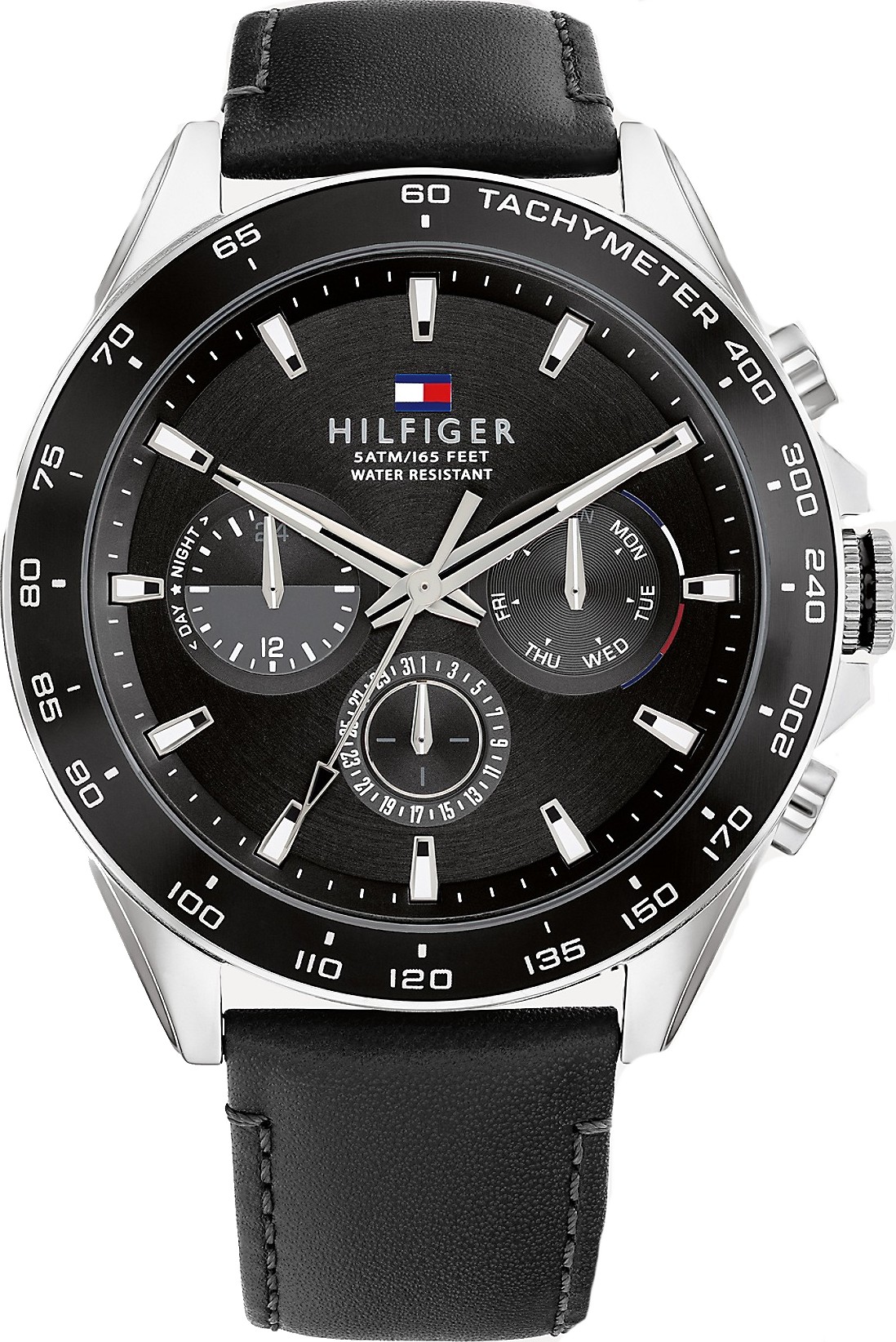 Đồng hồ nam Tommy Hilfiger. Bởi vì mọi chàng trai đều cần một chiếc đồng hồ phù hợp. Giới thiệu chiếc đồng hồ mới nhất của chúng tôi với thiết kế hiện đại, gọn gàng với vỏ bằng thép không gỉ, dây đeo bằng da màu đen và ba mặt số phụ hiển thị các thứ trong tuần, ngày và 24 giờ.