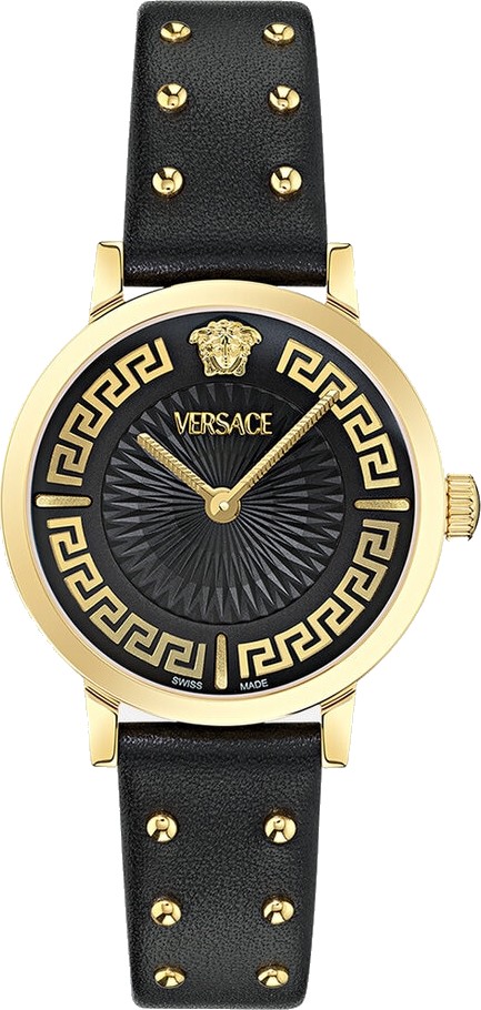 Đồng hồ Greca Fortuna là hiện thân của cả di sản lẫn hiện đại Versace, với biểu tượng Medusa 3D và logo Versace trên mặt số ở vị trí 12 giờ. Thiết kế thanh lịch được hoàn thiện bởi biểu tượng Greca nghiêng trên vòng trên cùng và đinh tán ba chiều trên dây da. Tất cả đồng hồ Versace đều được đảm bảo với nhãn hiệu 'Swiss Made'. Toàn bộ thép không gỉ đều được tái chế. Vỏ: Vỏ IP2N. Mặt số: Mặt số guillochè đen với họa tiết Greca trên vòng trong / Medusa và logo Versace ở vị trí 12 giờ. Dây đeo: Dây da bê với đinh tán và khóa lưỡi. Bộ máy: RONDA VE762E/3 Swiss Quartz 2 kim. Độ chống nước: 5 ATM. Vỏ: 1,4" / 35 mm.