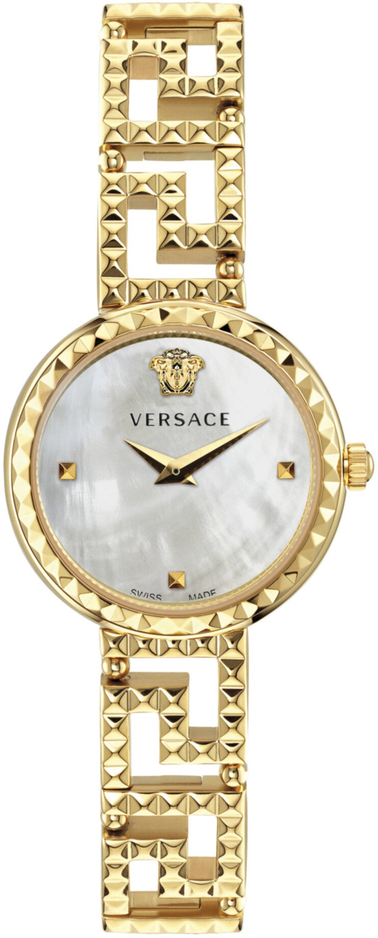 Chiếc đồng hồ trang sức thanh lịch này nổi bật với thân vỏ nữ tính 28mm được tô điểm bằng hình Medusa 3D ở vị trí 12 giờ. Chiếc đồng hồ nhỏ nhắn độc đáo này vô cùng tinh tế: vòng bezel được trang trí bằng các đinh tán, cũng như dây đeo trang sức hình Greca quý giá. Vỏ mạ vàng IP 28mm. Dây đeo mạ vàng IP. Mặt số khảm xà cừ trắng. Chống nước 3 ATM. Khóa gập. Bộ máy thạch anh 2 kim sản xuất tại Thụy Sĩ.