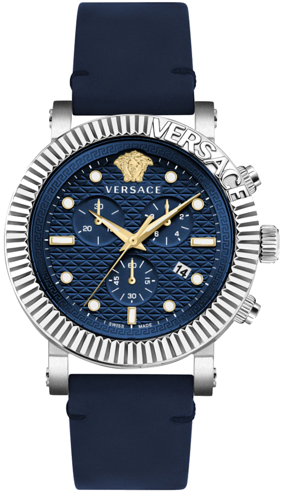 Bộ phận Nam. Mẫu Versace | V-Chrono Classic. Đặc điểm: Sản xuất tại Thụy Sĩ. Bộ máy: Chronograph, Ngày, Thạch anh. Màu mặt số: Xanh dương. Màu dây đeo: Xanh dương. Màu vỏ: Bạc. Chất liệu dây đeo: Da bê. Chất liệu vỏ: Thép không gỉ. Khả năng chống nước: 50 m (5 ATM). Kích thước vỏ: 45 mm. Kiểu dáng đồng hồ: Tròn. Dây đeo: Dây đeo liền khối. Quốc gia/Khu vực sản xuất: Thụy Sĩ. Chiều rộng dây đeo: 22 mm. Khóa cài: Khóa gài.