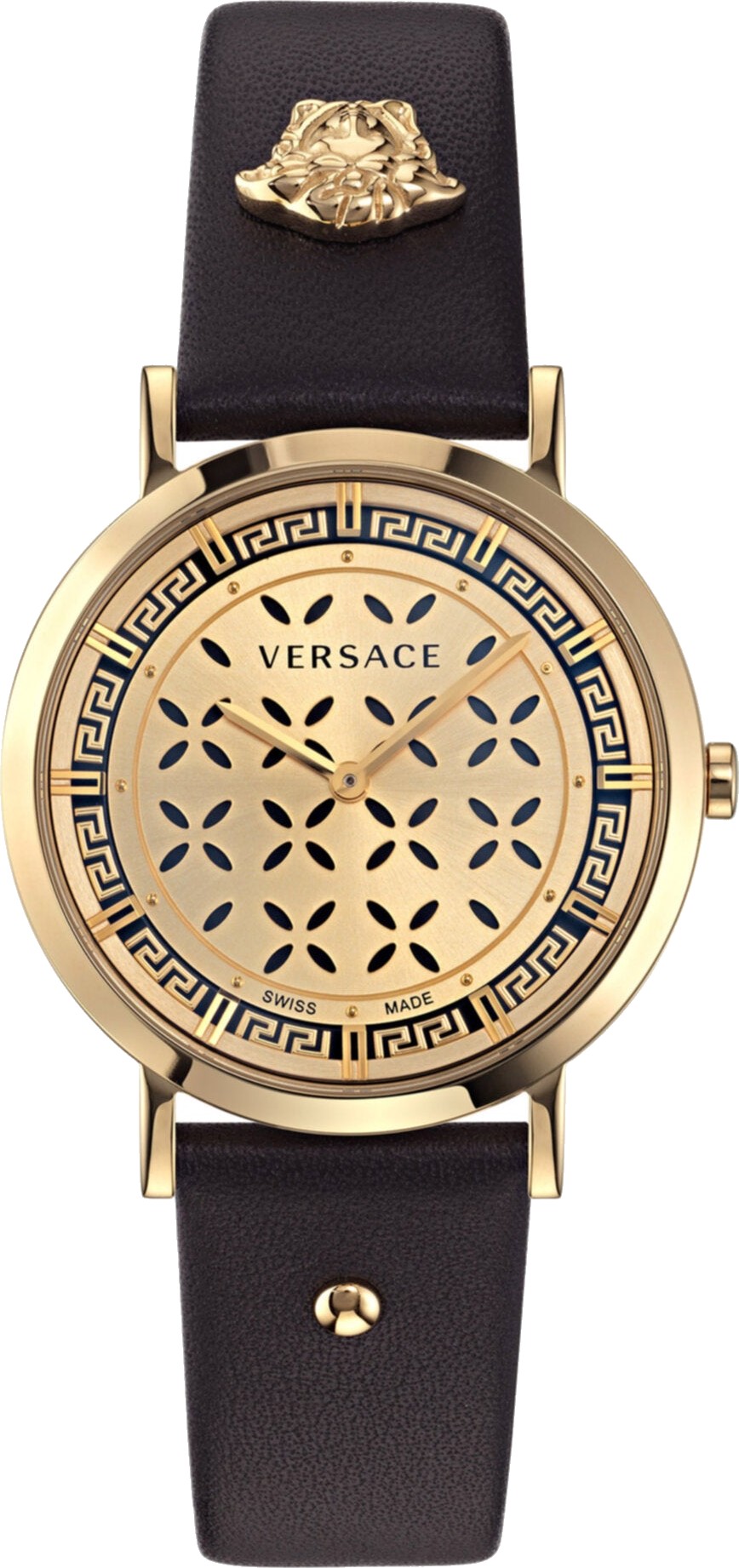 Vỏ 36mm mỏng và hiện đại của Versace sành điệu và hợp thời trang. Greca trang trí vòng trong trong khi mặt số được trang trí giống như một vườn hoa xinh đẹp. Chiếc đồng hồ có độ bắt mắt cao này là phụ kiện hoàn hảo dành cho thế hệ trẻ muốn thể hiện tình yêu của mình với thương hiệu Versace. Bộ sưu tập có phiên bản dây đeo bằng da với trang trí đầu Medusa ở vị trí 12 giờ và đinh tán ở vị trí 6 giờ hoặc dây đeo bằng lưới thời trang.