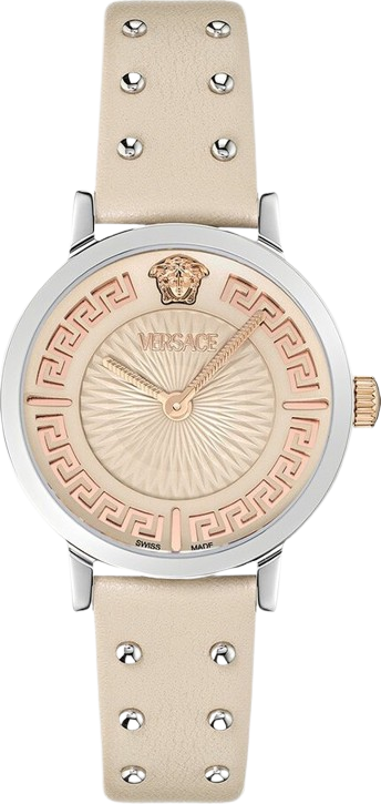 Đồng hồ Greca Fortuna là hiện thân của cả di sản Versace lẫn hiện đại, với biểu tượng Medusa 3D và logo Versace trên mặt số ở vị trí 12 giờ. Thiết kế thanh lịch được hoàn thiện với biểu tượng Greca nghiêng trên vành trên cùng và đinh tán ba chiều trên dây da. Tất cả đồng hồ Versace đều được đảm bảo nhãn hiệu "Swiss Made". Toàn bộ thép không gỉ đều được tái chế. Vỏ: Thép không gỉ. Mặt số: Họa tiết guilloché hồng với biểu tượng Greca trên vành trong/biểu tượng Medusa và logo Versace ở vị trí 12 giờ. Dây đeo: Da bê với đinh tán và khóa cài. Bộ máy: Bộ máy thạch anh Thụy Sĩ RONDA VE762E/3 với 2 kim. Độ chống nước: 5 ATM. Vỏ: 1,4" / 35 mm.