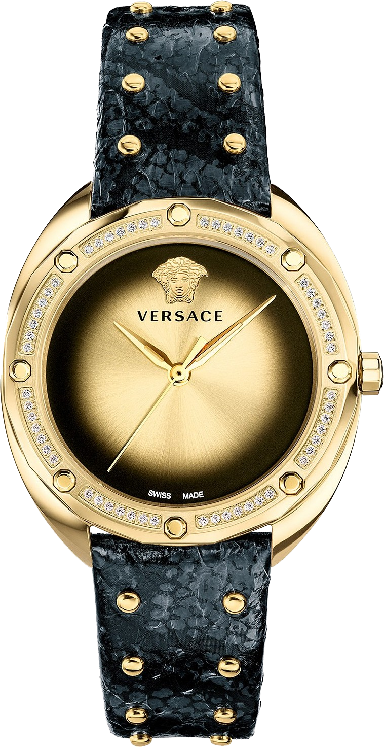 Hàng chục viên kim cương hoàn hảo kết hợp với các đinh tán tông vàng để tô điểm cho chiếc đồng hồ Shadov quyến rũ này của Versace. VEBM01118
