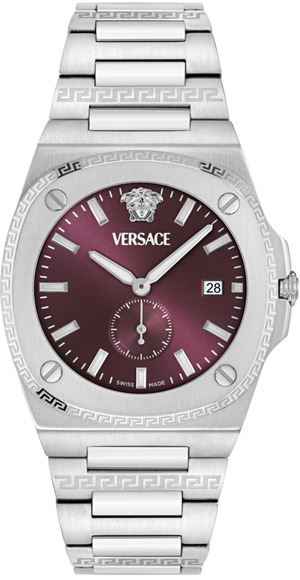 Chiếc đồng hồ vượt thời gian nhất chinh phục mọi phong cách. Vỏ hình học tinh tế mang đến cho chiếc đồng hồ này vẻ đẹp thanh lịch và tinh tế với thương hiệu tinh tế trên mặt số và chữ Greca được khắc trên các mắt xích xen kẽ của dây đeo. Vỏ thép không gỉ 40mm. Dây đeo thép không gỉ. Mặt số Burgundy Sunray. 5 ATM. Khóa gập. Bộ máy thạch anh 3 kim chỉ ngày sản xuất tại Thụy Sĩ