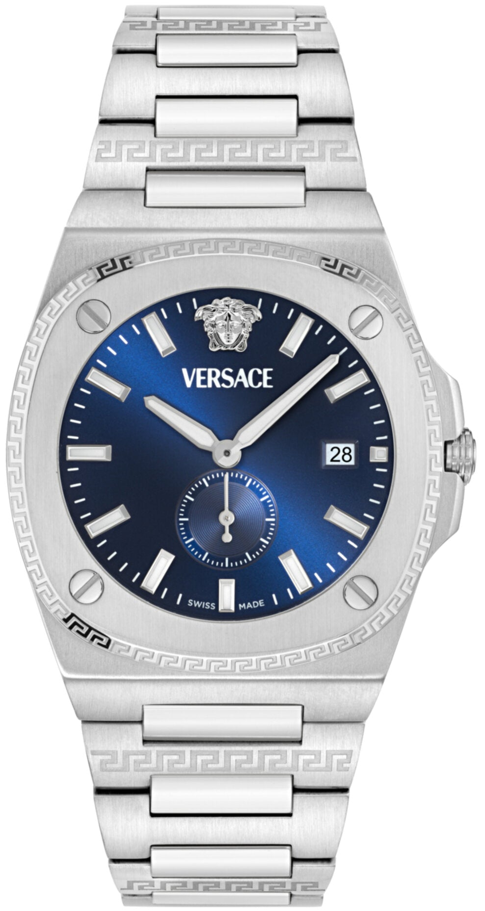 Chiếc đồng hồ vượt thời gian nhất, phù hợp với mọi phong cách. Vỏ hình học tinh tế mang đến cho chiếc đồng hồ này vẻ ngoài thanh lịch và sang trọng, với logo thương hiệu được khắc tinh tế trên mặt số và chữ Greca được khắc xen kẽ trên các mắt xích của dây đeo. Vỏ hai tông màu 40mm. Dây đeo hai tông màu. Mặt số trắng chải tia. Chống nước 5 ATM. Khóa gập. Bộ máy thạch anh 3 kim, hiển thị ngày, sản xuất tại Thụy Sĩ.
