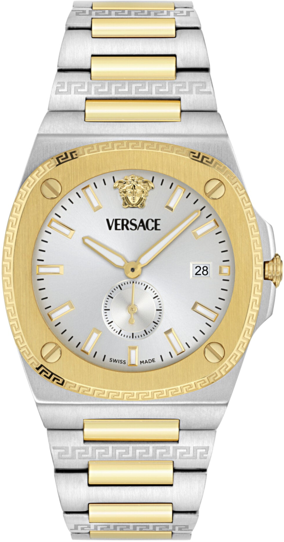Chiếc đồng hồ vượt thời gian nhất, phù hợp với mọi phong cách. Vỏ hình học tinh tế mang đến cho chiếc đồng hồ này vẻ ngoài thanh lịch và sang trọng, với logo thương hiệu được khắc tinh tế trên mặt số và chữ Greca được khắc xen kẽ trên các mắt xích của dây đeo. Vỏ hai tông màu 40mm. Dây đeo hai tông màu. Mặt số trắng chải tia. Chống nước 5 ATM. Khóa gập. Bộ máy thạch anh 3 kim, hiển thị ngày, sản xuất tại Thụy Sĩ.