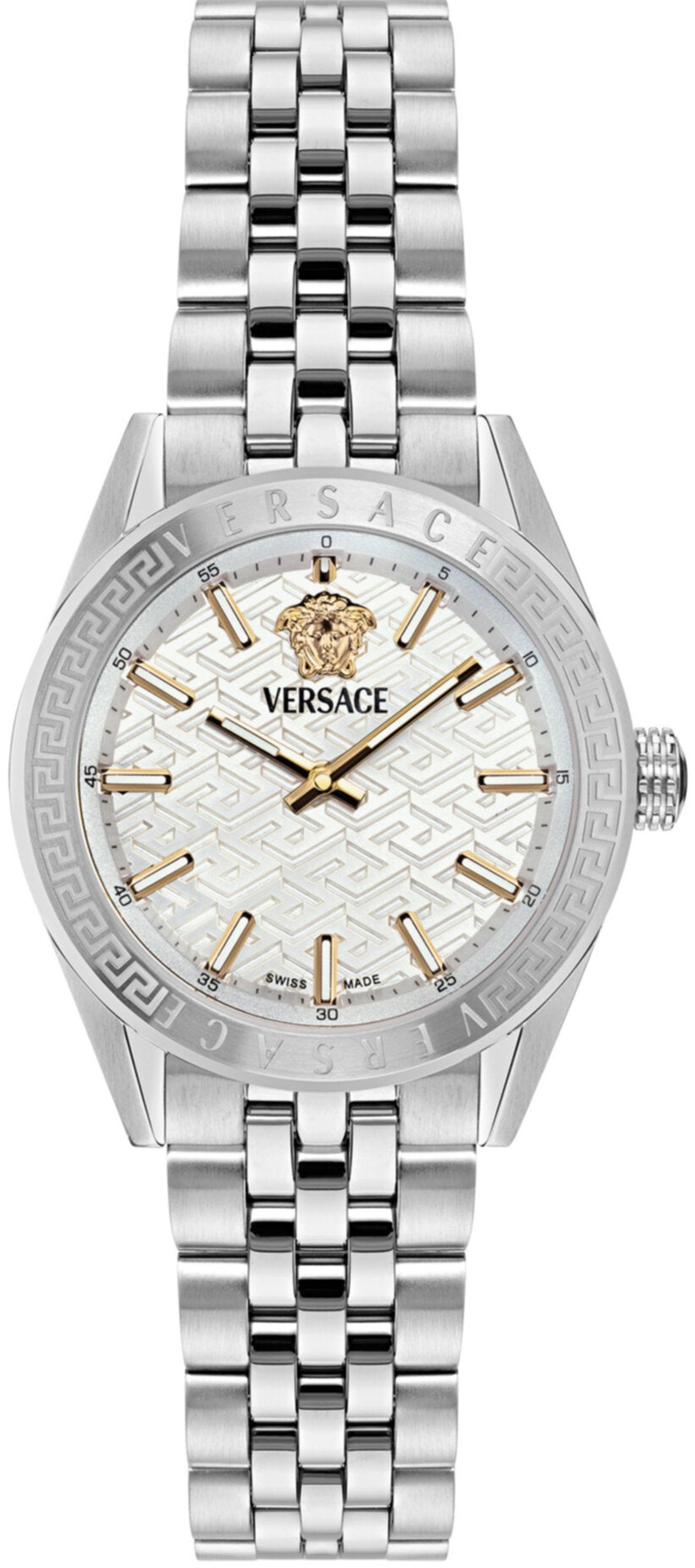 Chiếc đồng hồ cổ điển này sở hữu mặt số thanh lịch được tô điểm bằng họa tiết Versace La Greca và hình Medusa 3D ở vị trí 12 giờ. Vòng bezel được thiết kế tỉ mỉ mang đến vẻ ngoài quyến rũ, nổi bật với logo Versace ở vị trí 12 giờ. Vỏ đồng hồ 36mm được trang bị bộ máy 3 kim. Vỏ thép không gỉ 36mm. Dây đeo thép không gỉ. Mặt số Guilloche màu bạc. Chống nước 5 ATM. Khóa gập. Bộ máy thạch anh 2 kim sản xuất tại Thụy Sĩ.