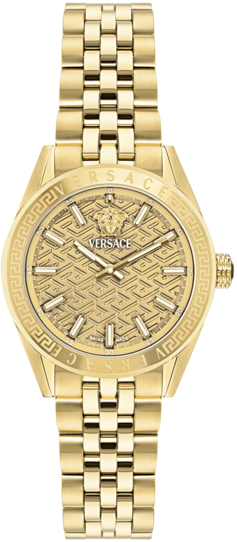 Chiếc đồng hồ cổ điển này sở hữu mặt số thanh lịch được tô điểm bằng họa tiết Versace La Greca và hình Medusa 3D ở vị trí 12 giờ. Vòng bezel được chế tác tỉ mỉ mang đến vẻ ngoài quyến rũ, nổi bật với logo Versace ở vị trí 12 giờ. Vỏ đồng hồ 36mm được trang bị bộ máy 3 kim. Vỏ mạ vàng IP 36mm. Dây đeo mạ vàng IP. Mặt số Guilloche vàng. Chống nước 5 ATM. Khóa gập. Bộ máy thạch anh 2 kim sản xuất tại Thụy Sĩ.