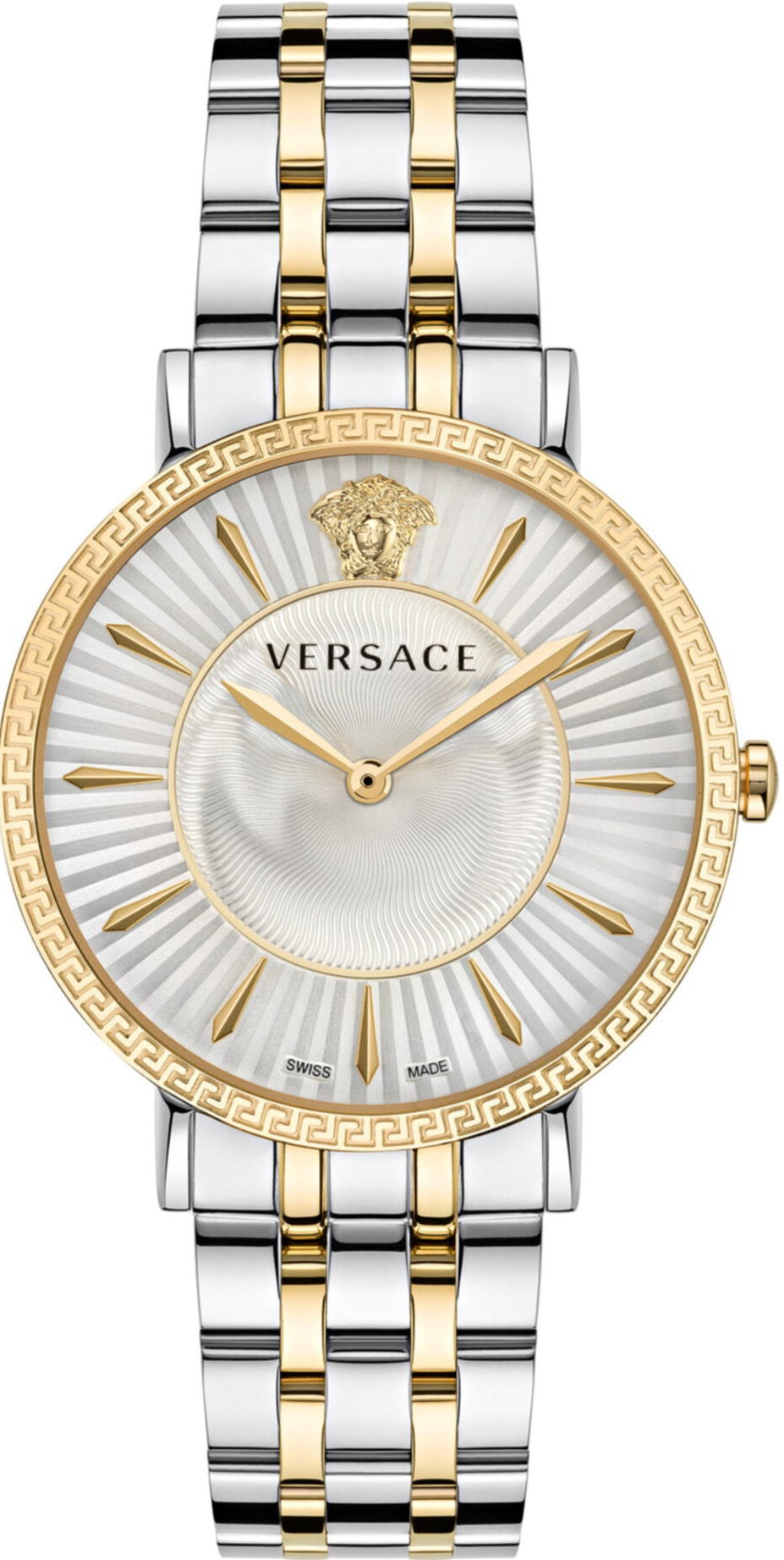 Vỏ thép không gỉ tông bạc với dây đeo bằng thép không gỉ hai tông màu (bạc và vàng). Vành thép không gỉ tông vàng cố định. Mặt số guilloche bạc với kim và vạch chỉ giờ tông vàng. Kiểu mặt số: Analog. Bộ máy Quartz. Mặt kính sapphire chống trầy xước. Núm vặn kéo/đẩy. Nắp lưng liền khối. Kiểu dáng vỏ tròn, kích thước vỏ: 38 mm. Khóa gập có chốt an toàn. Chống nước ở độ sâu 50 mét / 165 feet. Chức năng: giờ, phút. Đầu Medusa đánh dấu vị trí 12 giờ.