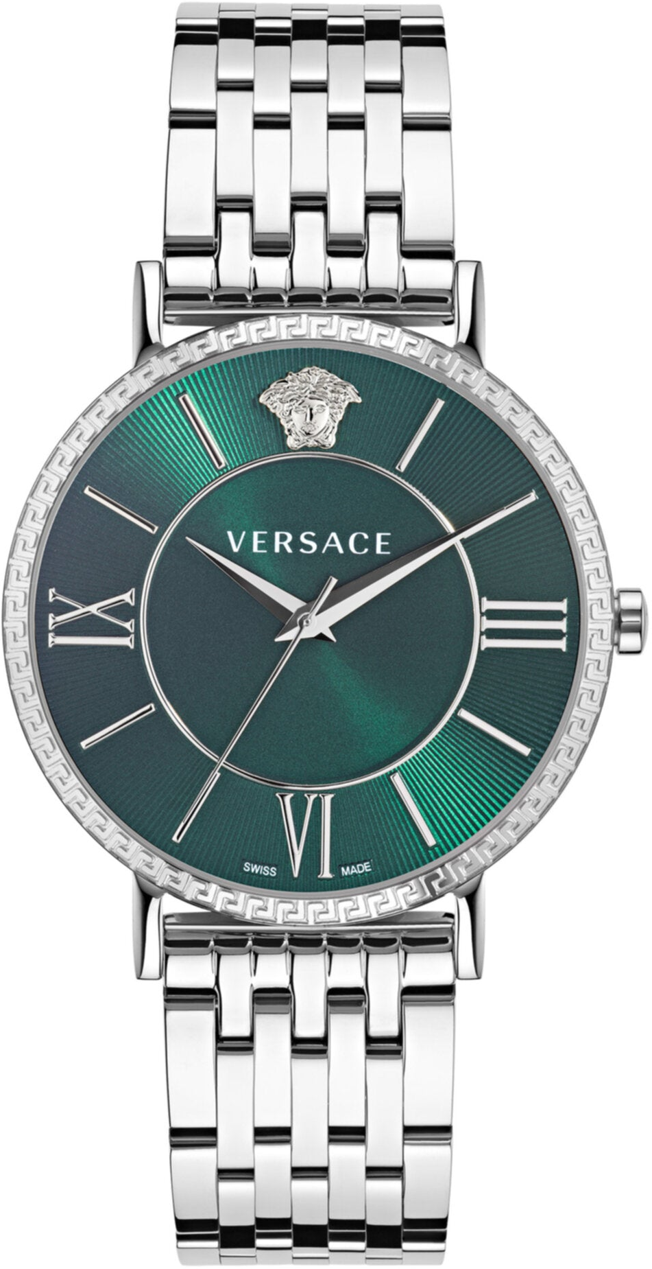 Một chiếc đồng hồ thanh lịch với số La Mã có biểu tượng Versace bao gồm Medusa ở vị trí 12 giờ và chữ khắc Greca trên mặt số. Vỏ thép không gỉ 42mm. Dây đeo bằng thép không gỉ. Mặt số Guilloche xanh lá cây. 5 ATM. Khóa gập. Bộ máy thạch anh 3 kim sản xuất tại Thụy Sĩ