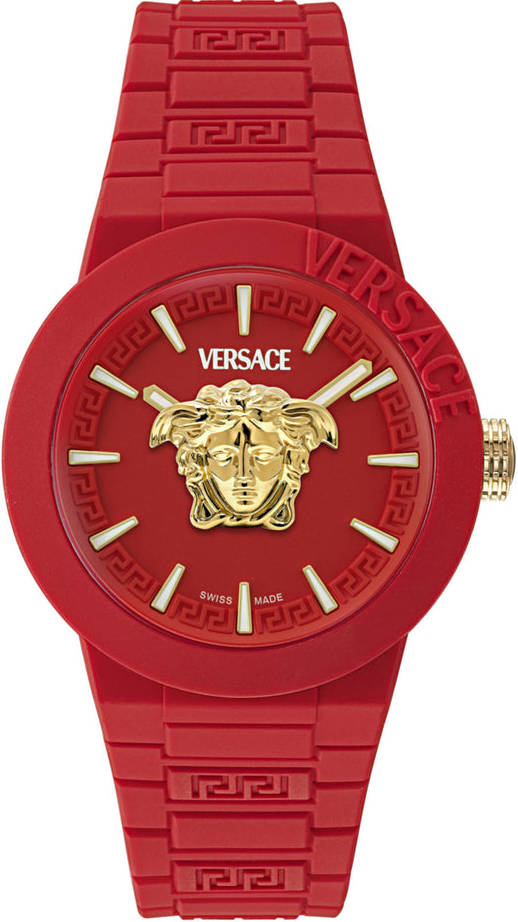 Tinh thần Pop trong DNA mới của Maison chính là nguồn cảm hứng chính cho bộ sưu tập này. Những gam màu tươi mới kết hợp với chất liệu silicon tạo nên một chiếc đồng hồ hoàn hảo, được tô điểm thêm bởi họa tiết Medusa và Greca bằng vàng IP. Một điểm nhấn thời trang khác là túi đựng silicon cùng màu. Vỏ đồng hồ 43mm dây đeo silicon màu đỏ. Dây đeo silicon màu đỏ. Mặt số màu đỏ mờ. 3 ATM. Khóa Ardillon. Bộ máy Quartz 2 kim sản xuất tại Thụy Sĩ