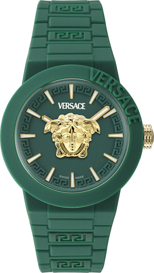 Những gam màu tươi mới kết hợp với chất liệu silicon tạo nên một chiếc đồng hồ hoàn hảo, được tô điểm thêm bởi họa tiết Medusa và Greca bằng vàng IP. Một điểm nhấn thời trang khác là túi đựng silicon cùng màu. Vỏ đồng hồ bằng silicon màu xanh lá cây 43mm. Dây đeo silicon màu xanh lá cây. Mặt số màu xanh lá cây mờ. 3 ATM. Khóa Ardillon. Bộ máy Quartz 2 kim sản xuất tại Thụy Sĩ.